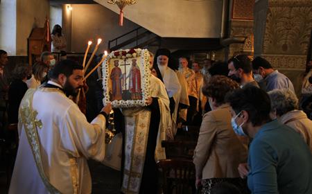 Στη συνέχεια, εναποτέθηκαν στον πανηγυρίζοντα Ενοριακό Ιερό Ναό Αγίων Κωνσταντίνου και Ελένης, Καλυβίων Καλαμάτας, ενώ ακολούθησε η τέλεση Αρχιερατικού Εσπερινού.