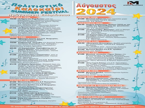 Δήμος Μεσσήνης: Πρόγραμμα Πολιτιστικών Εκδηλώσεων Αύγουστος 2024