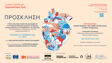 Το Σάββατο 11 Οκτωβρίου του 2025, η Ελλάδα έχει την τιμή να φιλοξενεί στην Καλαμάτα την «Ευρωπαϊκή Ημέρα Δωρεάς Οργάνων, Ιστών και Κυττάρων», υπό την αιγίδα της Βουλής των Ελλήνων. Με το μήνυμα «Δωρεά Οργάνων, Περισσότερη Ζωή», το δώρο ζωής από άνθρωπο σε άνθρωπο, μπαίνει στο επίκεντρο του δημόσιου διαλόγου. Με συμβολικές δράσεις σε όλη τη χώρα, αλλά και με τις εκδηλώσεις, που διοργανώνει κάθε ευρωπαϊκή χώρα την ημέρα αυτή, το σημαντικό μήνυμα θα μεταδοθεί, με σκοπό τη δημιουργία περισσότερων ευκαιριών ζωής για κάθε Ευρωπαίο πολίτη.