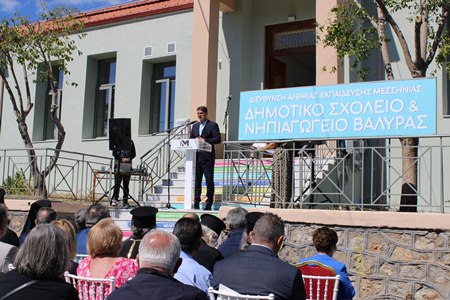 Ο Δήμαρχος Μεσσήνης Γιώργος Αθανασόπουλος στον χαιρετισμό του εξέφρασε την μεγάλη του χαρά για την ολοκλήρωση αυτού του έργου ενάμιση μήνα πριν την συμβατική του υποχρέωση και την παράδοσή του σε μαθητές και εκπαιδευτικούς για την έναρξη της νέας σχολικής χρονιάς. Τόνισε ότι η ποιοτική εκπαίδευση είναι ότι καλύτερο μπορούμε να προσφέρουμε στα παιδιά για την πρόοδό τους και η βάση για να προχωρήσει μία κοινωνία μπροστά. Σημείωσε ότι στρατηγικός στόχος της Δημοτικής Αρχής είναι να συνδράμει στην προσπάθεια αναστροφής του κλίματος της πληθυσμιακής συρρίκνωσης προσφέροντας έργα και υποδομές στους νέους. Κατόπιν αναφέρθηκε στο χρονοδιάγραμμα εκπόνησης των μελετών από τον Δήμο,στην άμεση ανταπόκριση του προέδρου της ΚΤΥΠ ΑΕκ. Κατσίπου και του διευθύνοντος συμβούλου της κ. Γιάνναρη για την πραγματοποίηση του έργου, και την αναβάθμισητου σχολείου από την ΚΤΥΠΑΕ σε κτίριο με μηδενικό ανθρακικό αποτύπωμα και σχεδόν μηδενική ενεργειακή κατανάλωση. Πρόσθεσε ότι ταυτόχρονα ο Δήμος με ιδίους πόρους ανακατασκεύασε τον περιβάλλοντα χώρο, διαμορφώνοντας γήπεδο μπάσκετ, κιόσκι σκίασης και αναμονής και το πάρκινγκ εξωτερικά του σχολείουκαι ευχαρίστησε όσους συνεργάστηκαν για την επίτευξη του έργου τονίζοντας ότι η Δημοτική Αρχή θα είναι πάντα δίπλα στους νέους με έργα και όχι με λόγια.