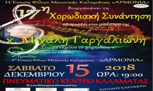 Η Ένωση φίλων μουσικής Καλαμάτας «Αρμονία» διοργανώνει το Σάββατο 15 Δεκεμβρίου στις 7:00μ.μ., στο Πνευματικό Κέντρο Καλαμάτας εκδήλωση προς τιμήν του μαέστρου Μιχάλη Γαργαλιώνη, για την πολυετή του προσφορά στην χορωδία.