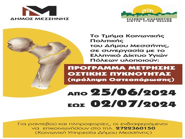 Η κοινωνική υπηρεσία του Δήμου Μεσσήνης σε συνεργασία με το Ελληνικό Διαδημοτικό Δίκτυο Υγιών Πόλεων, διοργανώνει πρόγραμμα μέτρησης οστικής πυκνότητας για την πρόληψη της οστεοπόρωσης. Το πρόγραμμα μέτρησης οστικής πυκνότητας θα υλοποιηθεί μεταξύ 25 Ιουνίου και 2 Ιουλίου ως εξής:
