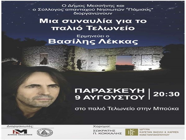Ο Δήμος Μεσσήνης και ο Σύλλογος απανταχού Νησιωτών “ΠΑΜΙΣΟΣ”, διοργανώνουν “Μια συναυλία για το παλιό Τελωνείο” με ερμηνευτή τον Βασίλη Λέκκα, στο Παλιό Τελωνείο στην Μπούκα, την Παρασκευή 9 Αυγούστου 2024, 8.30 μ.μ.