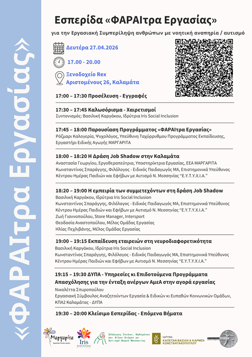 ΚΑΛΑΜΑΤΑ – Ένα κρίσιμο βήμα προς μια πιο συμπεριληπτική αγορά εργασίας πραγματοποιείται στη Μεσσηνία. Τη Δευτέρα 27 Απριλίου 2026, από τις 17:00 έως τις 20:00, το ξενοδοχείο REX στην Καλαμάτα (Αριστομένους 26) θα φιλοξενήσει την τελική εκδήλωση του καινοτόμου έργου «ΦΑΡΑΙτρα Εργασίας».