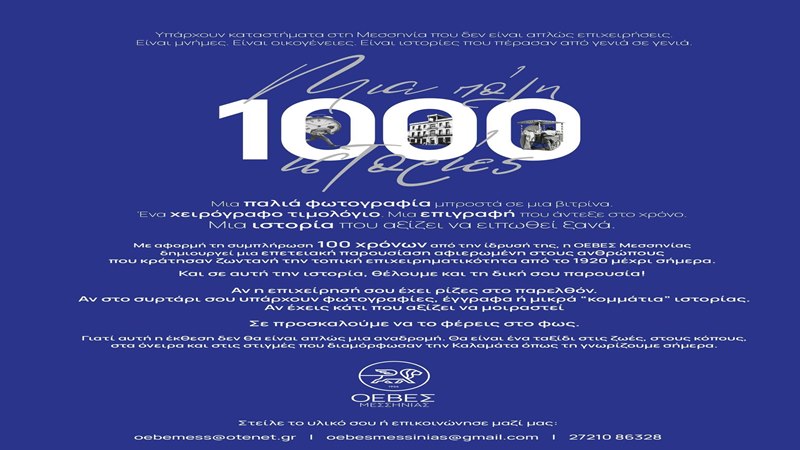 Έναν αιώνα ζωής, προσφοράς και δημιουργίας συμπληρώνει φέτος η Ομοσπονδία Επαγγελματικών Βιοτεχνικών και Εμπορικών Σωματείων (ΟΕΒΕΣ) Μεσσηνίας. Με αφορμή την ιστορική επέτειο των 100 χρόνων από την ίδρυσή της, η Ομοσπονδία προχωρά σε μια σπουδαία πρωτοβουλία: τη συγκέντρωση αρχειακού υλικού για τη δημιουργία μιας επετειακής παρουσίασης που θα αναδεικνύει την πορεία της τοπικής επιχειρηματικότητας από το 1920 έως σήμερα.
