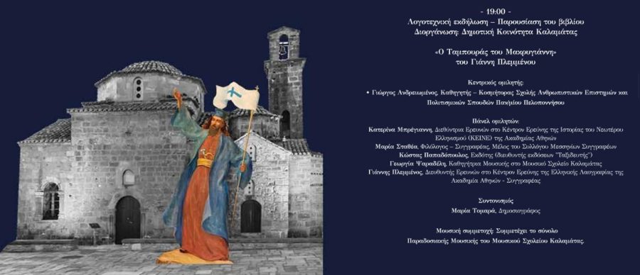 Η Δημοτική Κοινότητα Καλαμάτας διοργανώνει μια ξεχωριστή λογοτεχνική εκδήλωση την προσεχή Κυριακή 22 Μαρτίου. Στις 19:00, στην αίθουσα «Ρεγγίνα» του Πνευματικού Κέντρου, θα παρουσιαστεί το νέο βιβλίο του Γιάννη Πλεμμένου με τίτλο «Ο Ταμπουράς του Μακρυγιάννη». Η εκδήλωση εντάσσεται στο επίσημο πρόγραμμα εορτασμού του Δήμου Καλαμάτας.