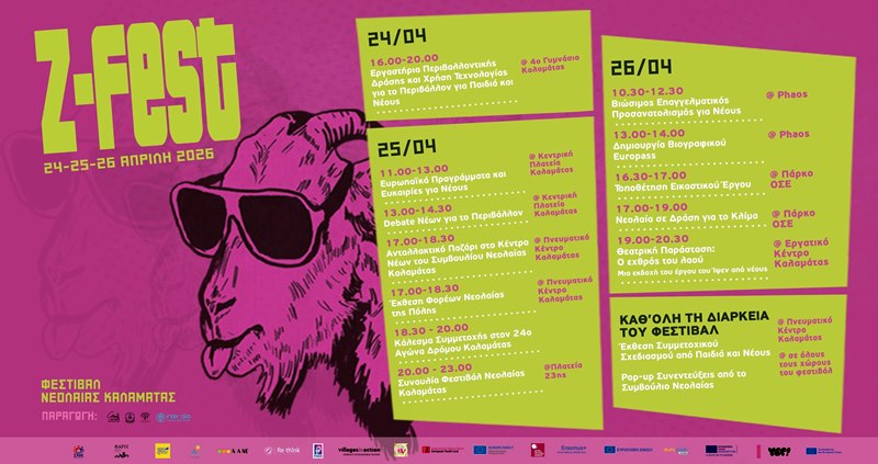 Ένας δυναμικός θεσμός γεννιέται στην καρδιά της Μεσσηνίας. Από τις 24 έως τις 26 Απριλίου 2026, η Καλαμάτα φιλοξενεί το Φεστιβάλ Νεολαίας Z-FEST. Η διοργάνωση ανήκει εξ ολοκλήρου στα νέα άτομα της πόλης. Το τριήμερο περιλαμβάνει δράσεις για το περιβάλλον, την τεχνολογία, την απασχόληση και τον πολιτισμό.